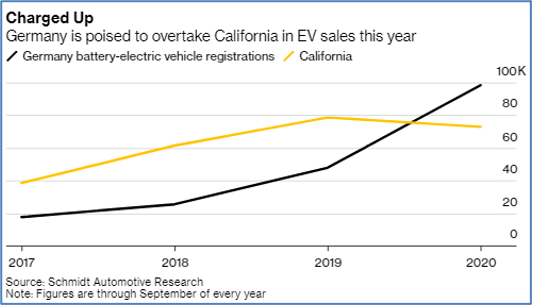 Road transport currently accounts for 25% of emissions in the UK, and a significant change will be required if the UK is to achieve its targets. Lessons can be learned from countries like Norway and Germany. Electric vehicle (EV) sales in Germany surpassed California’s this year for the first time, fuelled by a range of government incentives. Germans bought nearly 100,000 fully-electric cars in the first nine months of this year, roughly a third more than Californians. State subsidies play a huge part, alongside longer battery life and the greater travel distances it allows.