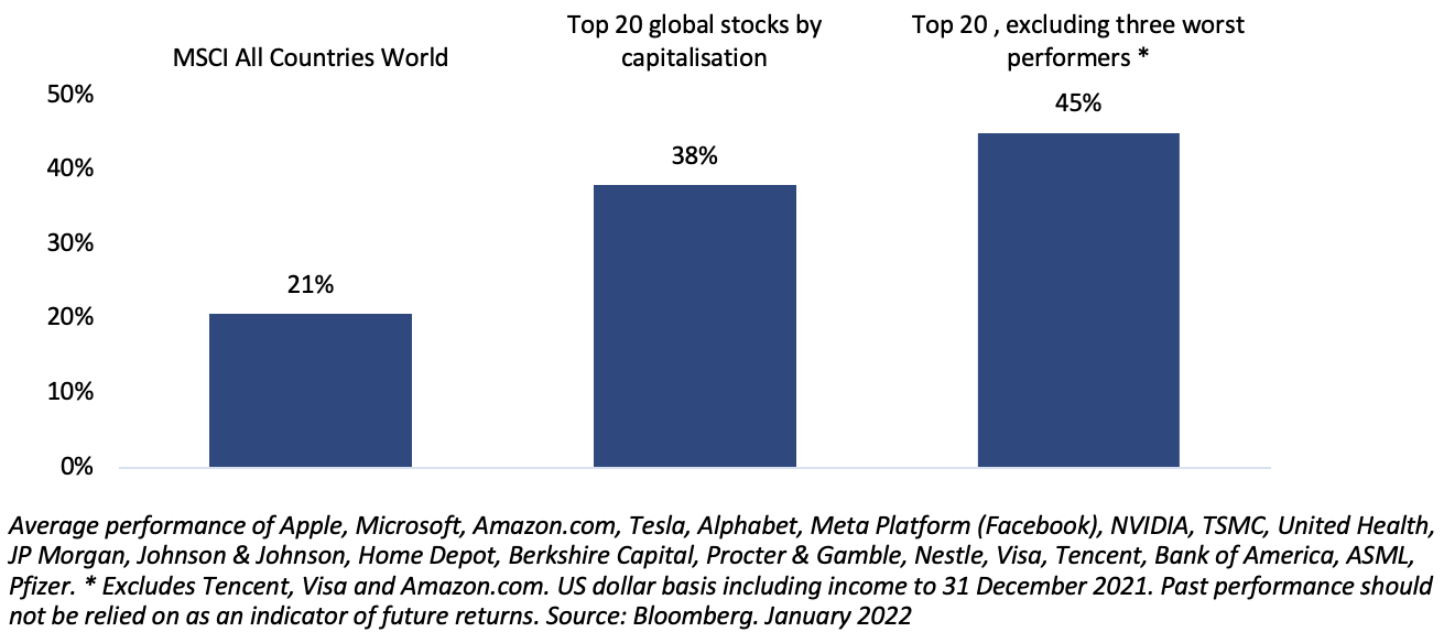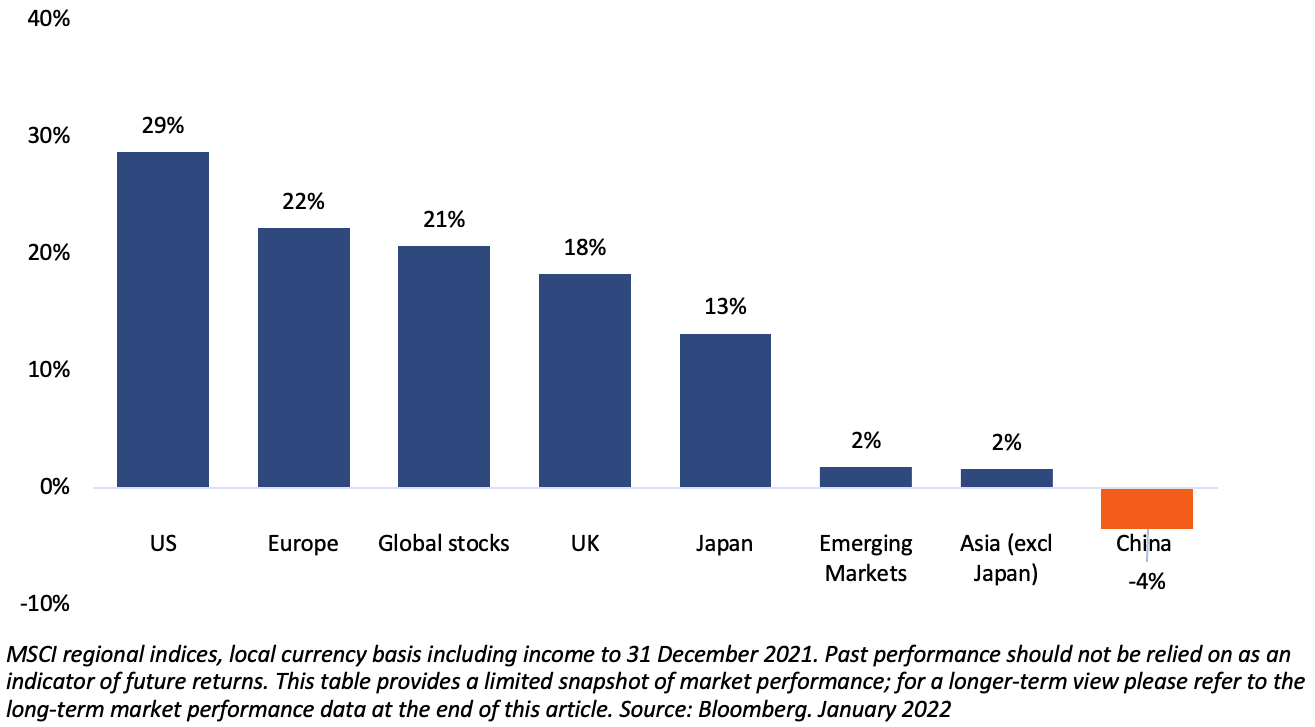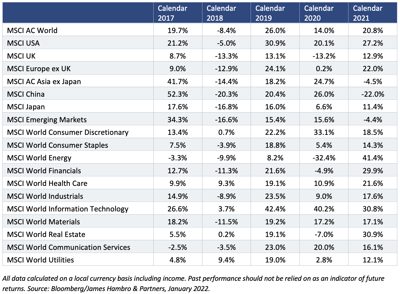Overall, world equities returned 20.7% in 2021, the sixth best year since 1995 and considerably ahead of the annualised return for world equities over the last five years of 12.9%. This is the third consecutive positive annual return, quite remarkable given the context of COVID.