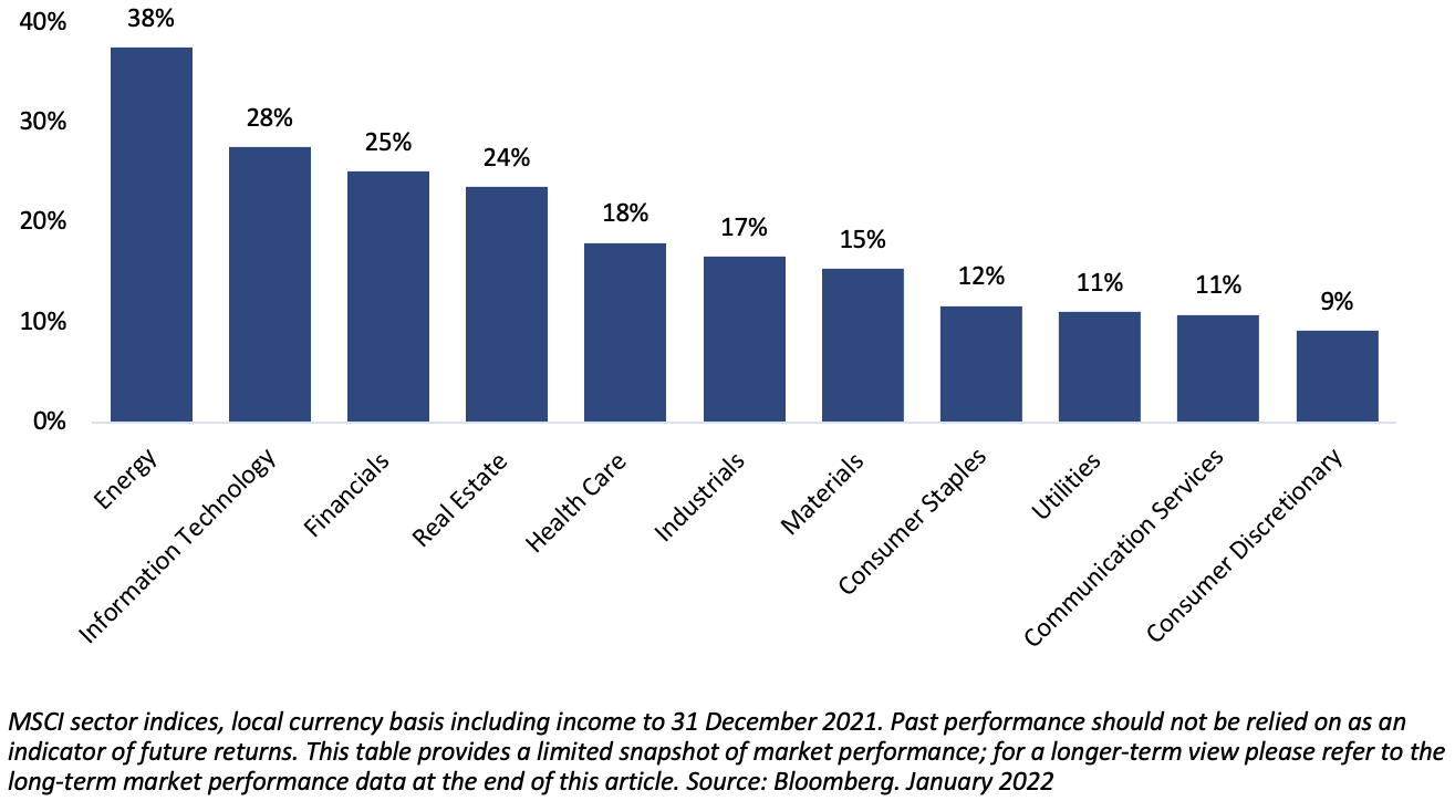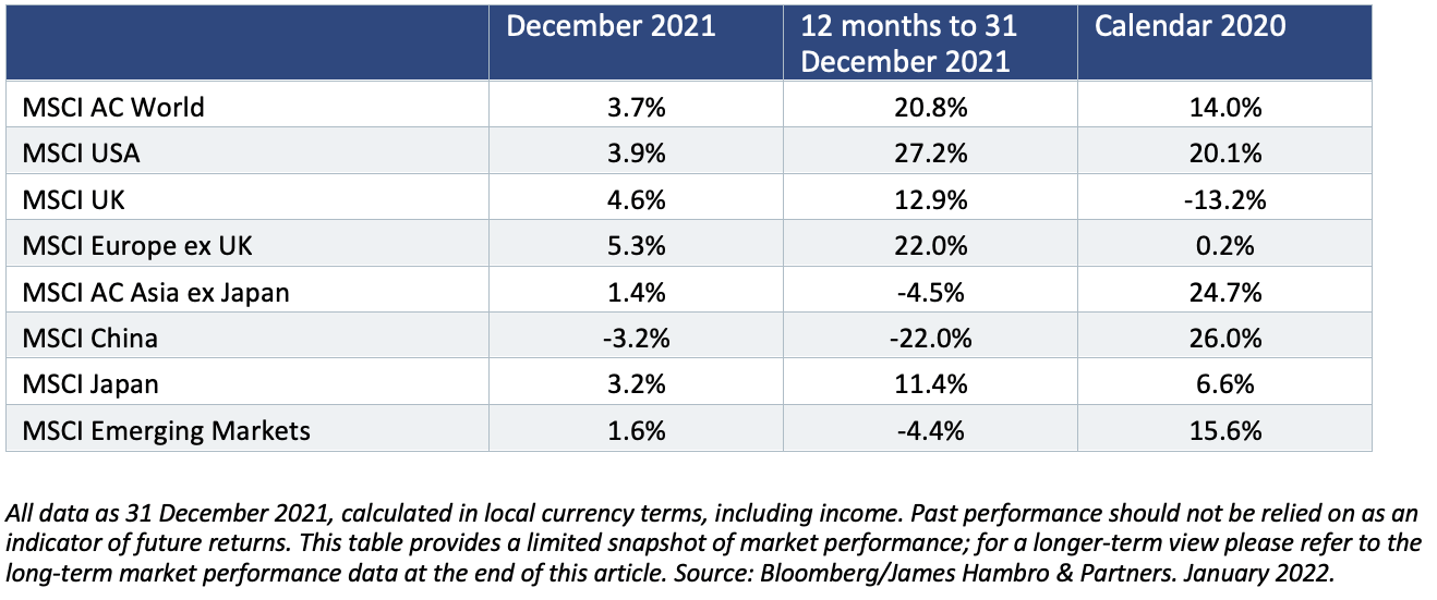 The end of the third quarter saw returns more or less flat, subdued by inflationary fears, arguably combined with a typical summer reduction in market activity. By contrast, the fourth quarter saw markets bounce back with a strong October and December book-ending weaker returns in November. In the end, the MSCI All Countries World Index returned 6.5% over the last three months of the year, making for a strangely coordinated pattern of 2021 quarterly returns: Q1 6.5%, Q2 6.9%, Q3 -0.4% and Q4 6.5% (local currency basis, including income).