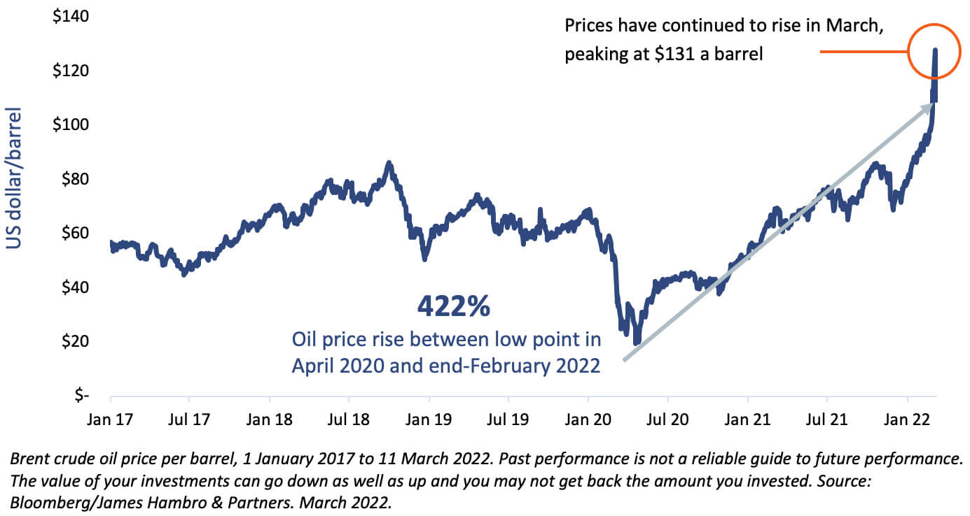 - Russia is the world’s second-biggest exporter of crude oil (11% of world exports) and also one of the largest natural gas exporters. As a result, energy prices have spiked upwards over fears that sanctions on Russia could cause global energy supply disruptions and the price of Brent crude oil reached as high as $131 a barrel. Prices have dropped back since the UAE intervened with OPEC to urge oil producers to increase production but are likely to remain elevated while the crisis endures.
