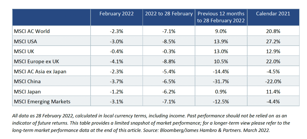 The eruption of hostilities sent stocks tumbling across the board. The MSCI AC World Total Return index fell –2.3% in February and is down -7.1% over the year-to-date, in local currency terms. It was a particularly painful month for Europe, which is heavily dependent on Russia for energy supplies, although the EU has hurriedly put plans in place to reduce this reliance.