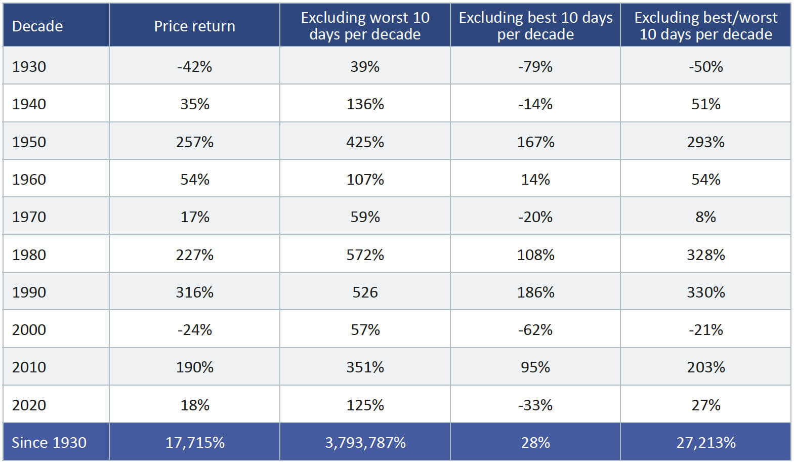 Bank of America looked at the impact of missing the market’s best and worst days each decade