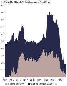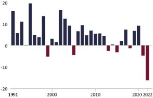 Equity market valuations reset in a flash. The MSCI All Company World Index fell by 16% in local currency terms, its biggest fall since 2008 and the third biggest drawdown this millennium. The more expensive areas of the market were hit the hardest. This meant the US, the more technology-focused Nasdaq index declined by over 30%. China too was weak given the stubborn adherence to zero-COVID policies, a deflating property sector and concerns over the ramifications of President Xi’s consolidation of power.