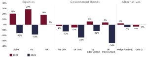 Source: Bloomberg/James Hambro & Partners. December 2022. Equities: Global is MSCI AC World Index, US is S&P 500, UK is FTSE All-Share. Bonds: US Govt is BB US Government Conventional Index, UK Govt is FTSE Actuaries All Gilt Index, US Index-Linked is BB US Government Inflation-Linked Index, UK Index-Linked is FTSE Actuaries UK Index Linked Index. Alternatives: Hedge Funds is HFRX Equal Weight Strategies. Past performance is not a reliable indicator of future results.