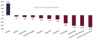 Underlying these headline returns, the dispersion in sector performance was extreme with a 70% spread between the best and the worst. There was only one place to hide, with the energy sector up 35%. All other sectors fell. Facebook (Meta) and Tesla, bellwethers of the tech boom, fell by 70% as the big tech companies lost $5 trillion in market value alone – total UK GDP in 2021 was only $3.2 trillion.
