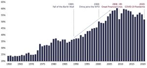 Trade as a percentage of Global Gross Domestic Product peaked in 2009 at 65% and it had fallen by 10% even before the pandemic and last year’s events in Europe. The primary reason is clear.