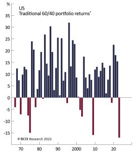 As growth decelerated there was more than a whiff of stagflation about asset returns. World equities delivered their worst year since the depths of the financial crisis whilst bond markets collapsed. A 60/40 portfolio (60% equities, 40% bonds) – the traditional balanced strategy’s North Star – lost 17% in US dollar terms in 2022, the worst performance in 50 years. Commodities and the dollar were the only assets to hold up in a year when the end of zero interest rates and the death of free money meant the deflation of asset prices across the world.