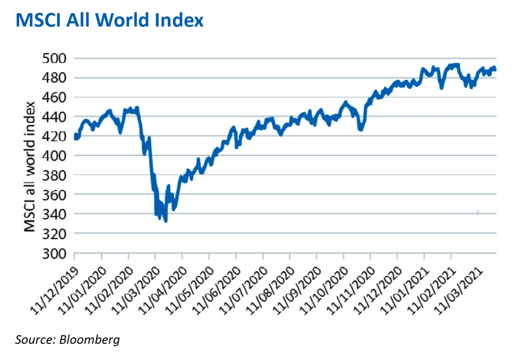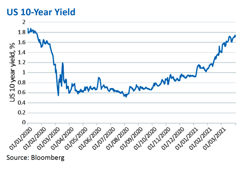 As we lap the anniversary of the depths of the crisis and collapse in energy prices, higher inflation seems a mathematical certainty in the near term. Central banks, led by the Federal Reserve, are unperturbed. Chairman Jerome Powell has signalled a belief that any short-term spikes in inflation will ease as supply constraints normalise.  The bond markets are unconvinced, testing the central bank’s resolve to keep rates low. Since the start of the year the US 10-year treasury yield has risen from 0.9% to 1.7%, recapturing all the downdraft caused by the pandemic. On average, US bonds have fallen -3.2% in dollar terms and UK Gilts -4.2%.