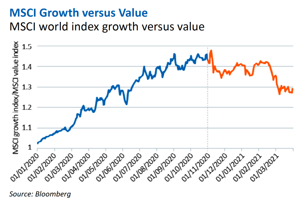 We continue to see plenty of opportunity in equity markets and our investments, although they have lagged the broader market index this year. Our preference for businesses with dependable profitability and limited volatility has been out of favour in the early cycle ‘dash for trash’. While at an aggregate level the MSCI World Index rose 4% in local currency terms, splitting the underlying constituents into baskets of growth, quality, and value shows the returns are markedly different at 0.1%, 2.9%, and 8.9% respectively. As can be seen from the following chart, it was the advent of the vaccine that drove a shift in leadership from growth and quality to value.