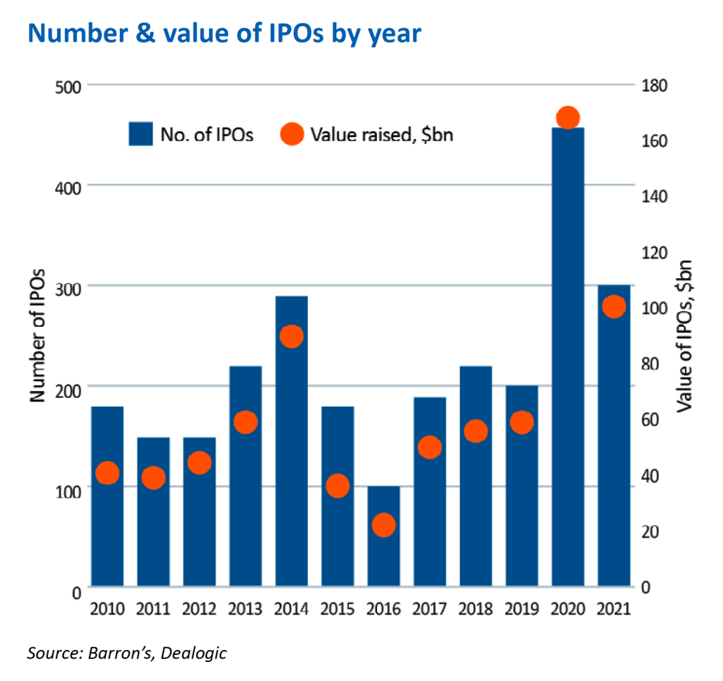 2021 has also been punctuated by an increase in unconventional and, in some cases, alarming behaviour. Volumes of initial public offerings and the proliferation of Special Purpose Acquisition Companies (SPACs) raise concerns that excess liquidity and low interest rates are driving higher levels of speculation. Additionally, with consumers feeling flush with cash and little opportunity to spend, retail activity is fuelling bubble-like prices in certain pockets of the market. Prices of some companies look to have decoupled from underlying fundamentals driven by rumour and momentum, as the urge to participate is driven more by greed and the fear of missing out than any genuine understanding of the asset in question.