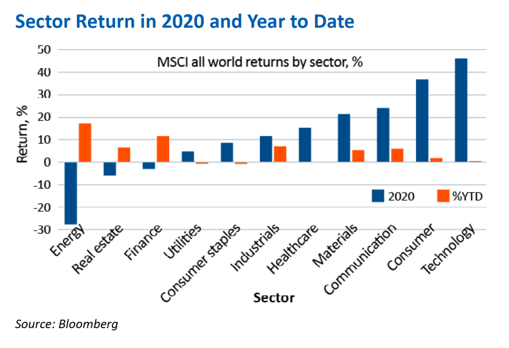 Netflix, the video streaming giant, added 37m new subscribers in 2020, 33% more than the year before. Amazon’s online sales growth accelerated from 15% in 2019 to 40%, and Zoom’s revenue increased three-fold; the video conferencing application has gone from near obscurity to the status of its name being used as a verb. Microsoft’s sales, driven by the need for corporates to build flexible/cloud-based IT infrastructure, never skipped a beat growing at 15% in each quarter of fiscal 2020, faster than the 14% growth of 2019. In contrast, banks, energy, and companies dependent on social interaction for their revenues all suffered. Of course, some of this will revert as restrictions lift but the world after lockdown will in many ways have changed for good.