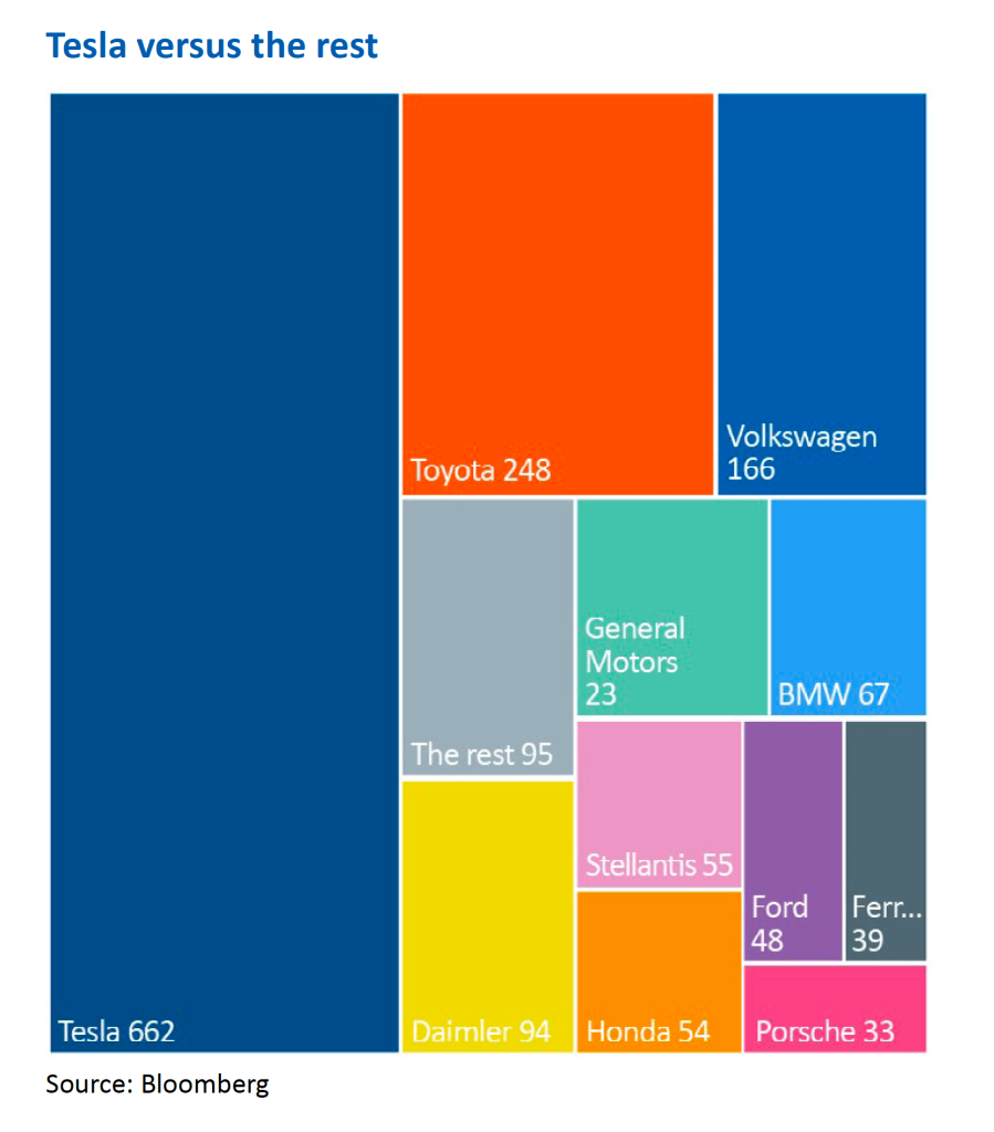 Story stocks have been the largest beneficiaries – companies that tell a great story about their potential but where today’s share price appears far removed from the realities of their profit potential. Tesla might be the poster child for this phenomenon, but it is just one of many. Largely down to the cult-like status of the CEO, Elon Musk, the share price of Tesla has risen from $75 at the start of 2020 to $900 at its recent peak ($670 at the time of writing). We are not disputing the potential for Tesla to be one of the world’s largest car companies in time but at a market cap of $662bn it is already nearly three times larger than the next largest company, Toyota, and larger than all the rest combined. Putting this into context, in 2020 Tesla delivered 500,000 vehicles compared to Toyota’s 2.1 million.
